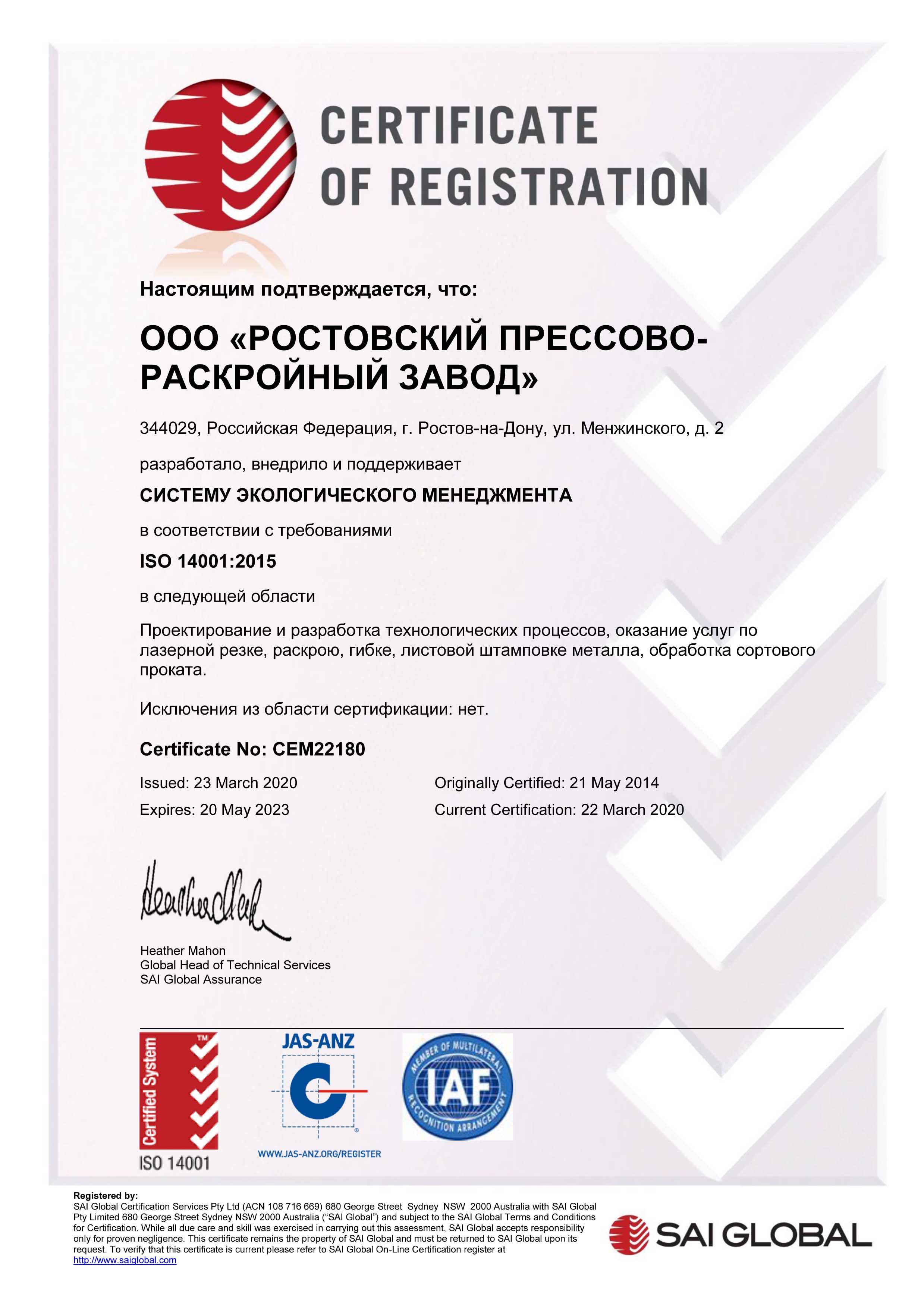 РПРЗ продлил срок действия сертификата ISO 14001: 2015 до 2023 года.